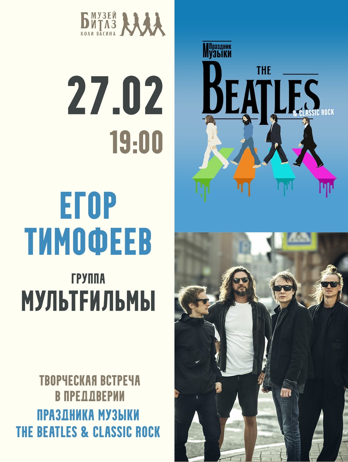 27 февраля (пт) в 19:00, Музей Битлз Коли Васина: в преддверии Праздника Музыки The Beatles & Classic Rock знакомимся с участниками фестиваля - инди-поп группой МультFильмы. Поговорим о творчестве, влиянии музыки Битлз и новом альбоме ребят с Егором Тимофеевым. Вход по записи в личных сообщениях в группе Музея вконтакте.
